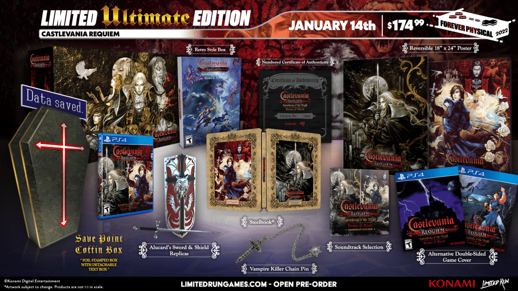 For superfans, the Ultimate Edition includes everything the Classic Edition does, plus an exclusive Steelbook case, a Coffin Box with Save Point Text, a 5-inch replica of Alucard’s sword and shield on a stand, a Vampire Killer pin, two additional retro cover sheets, and a certificate of authenticity.