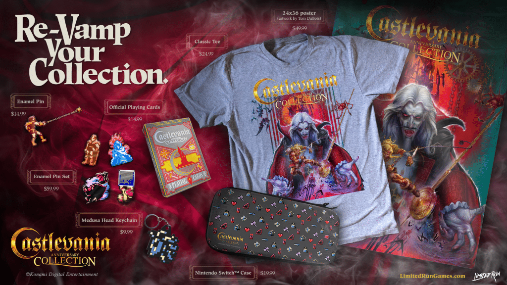 In addition to the physical releases, Limited Run is bringing out new merch for Castlevania fans. The Castlevania Anniversary Collection (which should start shipping sometime soon) has new merch including playing cards, a Nintendo Switch case, a t-shirt, posters, pins, and more.