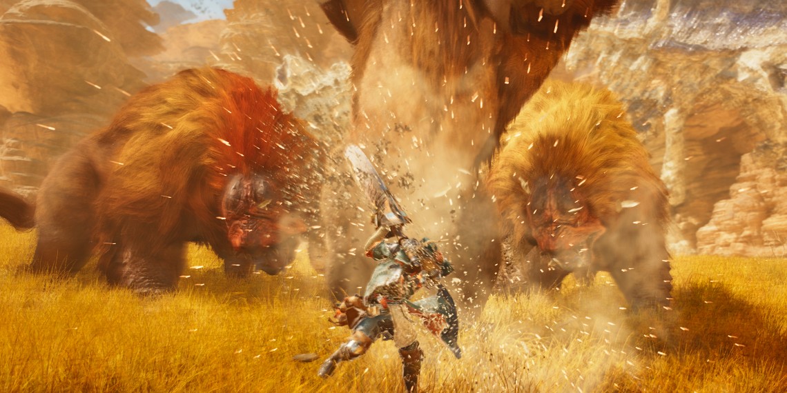 The second quest was much more straightforward. It was to find this alpha monster, the Doshaguma, and eliminate it. The issue, though, is that a pack flanks the beast. The pack consists of smaller, less punishing monsters, but they can still mess you up if you go into it full bore. The key is getting the alpha away from the pack. This version of hunting was pretty interesting because they showed us how to do it in the game by throwing dung at them. The monsters spread off in different directions, but you also have to hope that the alpha doesn’t go in the same direction as the others. Once the bear monster was separated, it was a full-on battle to take it down.