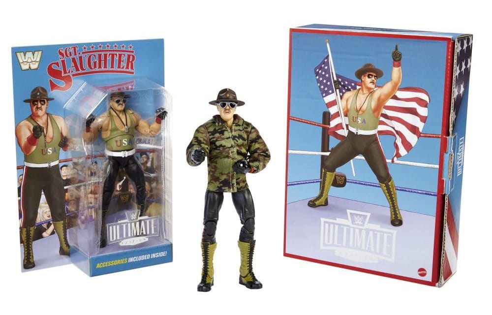 - A-ten-hut! It’s the ultimate action figure of WWE® Sgt. Slaughter™ with an extra head, swappable hands, and authentic entrance gear in special collectors packaging.